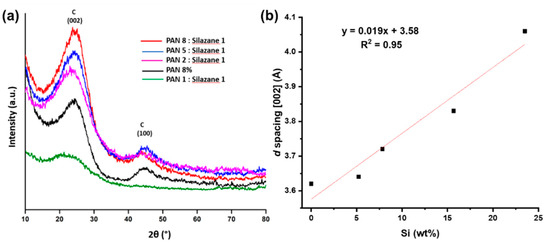 (a) XRD of carbon fibers obtained at 1000 °C with varying PAN:silazane ratios; (b) plot of (002) spacing vs. Si wt%, data from (a).