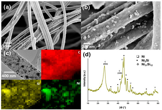 (a,b) SEM images, (c) TEM image, and EDX scans, red: carbon, yellow: silicon, green: nickel (d) XRD diffractogram of 8:1:4 PAN:silazane:NiCl2 fibers pyrolyzed at 1000 °C.