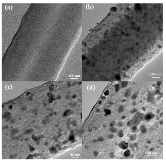 TEM images of 8:1:4 (PAN:silazane:NiCl2) fiber samples pyrolyzed at (a) 600 °C, (b) 700 °C, (c) 800 °C, (d) 900 °C.