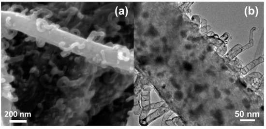 It was interesting to observe carbon nanotube (CNT) formation on the nanoparticles during pyrolysis (Figure 4). Nickel silicide has been shown to catalyze the growth of CNTs at 600–700 °C [24], paired with the carbon sourced from decomposing silazane (i.e., H2 and CH4). The nanoparticles remained on the nanofiber surfaces during the growth of the CNTs, suggesting a strong adhesion of the nanoparticle to fiber surfaces. Although CNT production was not the primary focus of this study, the observation demonstrated the potential of carefully selected catalysts and reagents for in situ production methods of additional nanomaterials beyond the PDC composites.