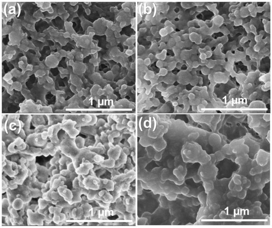 SEM images of Se NPs prepared from the CO extract under magnetic stirring condition with the Se4+/CO volume ratio of (a) 1/1, (b) 1/2, (c) 1/3, and (d) 1/4.