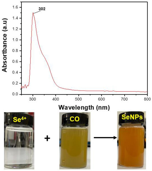 It has been well evident from previous works that the polyphenols content in the leaf extract could reduce Se4+ ions to form metallic Se NPs [36,41,42]. With a polyphenols contents of approximately 13%, the CO extract could be utilized as an effective reducing agent for the green synthesis of metallic nanoparticles [4,10]. In this work, the CO extract was employed as a reductant to synthesise Se NPs from Se4+ precursor; the formation of Se NPs was initially observed using UV-vis spectroscopy. Figure 3 shows the UV-vis spectrum and optical images of the resultant Se NPs. When the diluted CO extract, in light yellow colour, reacted with the Se4+ precursor, in transparent colour, a light red solution was obtained, which is demonstrated to be a typical colour of the metallic Se NPs [43]. This colour change was observed only after 30 min and completed after 2 h of reaction time. The red colour of the resultant solution is ascribed to the surface plasmon vibration in excitation state from SE NPs [44]. It has been well known in the literature that the UV-vis spectrum of Se4+ ions shows no absorption peak, indicating no surface plasmon vibration effect occurs in this state. Intriguingly, the UV-vis spectrum of Se NPs in Figure 3 exhibits a high-intensity absorption peak at 302 nm. This absorption band is ascribed to the surface plasmon vibration in excitation state of Se NPs [45]. This result primarily assures us that the polyphenols content in the CO extract successfully reduced the Se precursor to form metallic Se NPs.