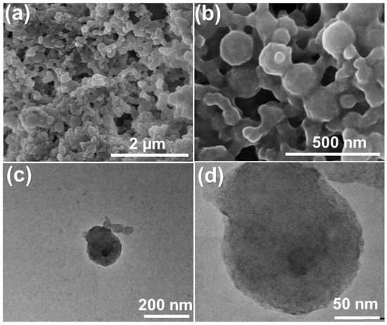 SEM (a,b) and TEM (c,d) images of the Se NPs prepared with the Se4+/CO volume ratio of 1/2.