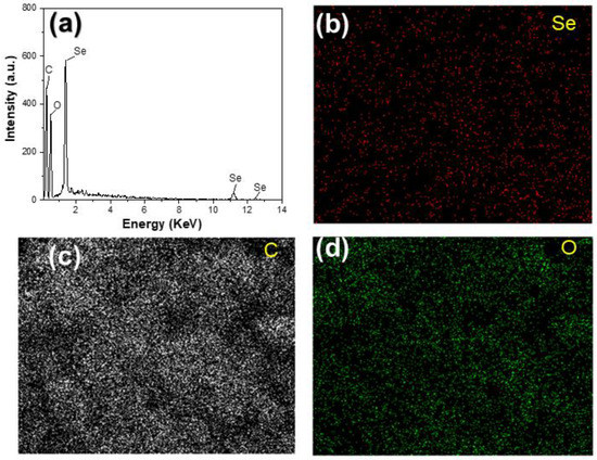 (a) EDS spectrum and EDX mapping (b–d) of the Se NPs prepared with the Se4+/CO volume ratio of 1/2.