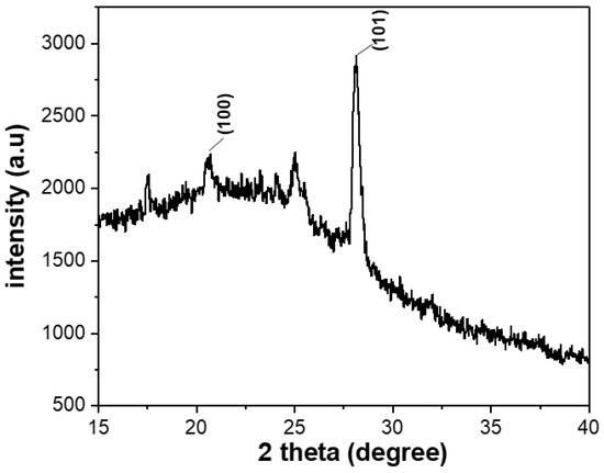 The appearance and crystallinity of the Se NPs in the sample were further confirmed using X-ray diffraction analysis. The XRD pattern of the Se NPs prepared with the Se4+/CO volume ratio of 1/2 is shown in Figure 6. The diffraction peaks at around 20 and 30o in the XRD pattern are assigned to the (100) and (101) planes, respectively, of metallic Se nanoparticles with trigonal phase containing lattice constants in structure: a = 4.366 Å and c = 4.956 Å (JCPDS file no. 06-362) [32,46]. The other peaks present in the XRD spectrum might be attributed to the diffraction peaks of the selenium oxide, which is partially oxidized from the presence of oxygen in the media reaction.