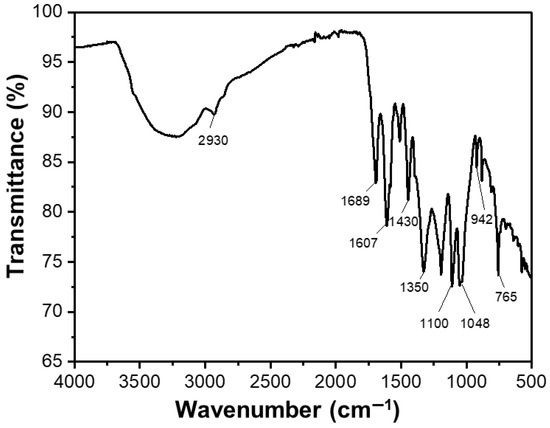 The chemical bonding nature in the Se NPs product was investigated using FTIR spectroscopy and the result is shown in Figure 7. The broad absorption band ranging from 3200–3600 cm−1 in the FTIR spectrum belong to the O-H bonding of moisture, alcohols, and phenols groups in the extract [10,47,48]. The characteristic vibration appearing at 2930 cm−1 is assigned to the C-H stretching bonds of alkynes. The C=O stretching group in the cetone and aldehyde groups is also observed at 1687 cm−1 in the FTIR spectrum. The strong vibration peaks at 1607 cm−1 and 1430 cm−1 are attributed to the N-O asymmetric bonding in nitro compounds and C-C bonding in ring of aromatics, respectively. The strong absorption peak at 1350 cm−1 is assigned to the C-H stretching in alkanes. Several vibration bands at 1100 and 1048 cm−1 are attributed to the C-N bending of the amines [35]. The O-H group in the carboxylic acids is also evident at the vibration band of 942 cm−1. The characteristic FTIR peak at 765 cm−1 is ascribed to the bending of C-H in alkyl halides. This result demonstrates that the prepared Se NPs’ surfaces were successfully covered by various functional groups, which are responsible for the reduction as well as stabilization of the resultant Se NPs. The organic compounds in the extract have been demonstrated to be stabilizing agents for the metal nanoparticles [29]. However, further study on the active molecules responsible for the synthesis as well as the protection of the Se NPs is needed.