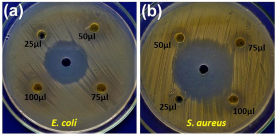 Bioactivity of the Se prepared with the Se4+/CO volume ratio of 1/2 against (a) E. coli and (b) S. aureus at the Se NPs various doses of 25, 50, 75, and 100 µL (concentration of 300 ppm).