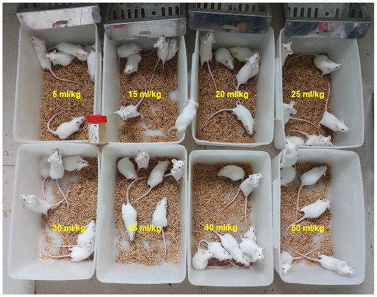 The toxicity and ecotoxicology of metal nanoparticles are commonly investigated using the lethal concentration (LC50) and acute toxicity protocols. The lethal concentration is the dosage of nanoparticles that causes the death of 50% of test animals in a certain period of time. This factor is important to evaluate the safety of nanoparticles employed in animals and the human body in terms of biological and ecological aspects. This study investigated the effect of Se NPs prepared by the CO extract with the Se4+/CO volume ratio of 1/2 on the acute toxicity and response of mice during 72 h of administration. Figure 9 exhibits the optical images of mice administrated with various doses of 300 ppm Se NPs. It is obvious from the result that the activity and food consumption of mice with normal responses to surrounding environments were observed at the Se NPs’ dosage of <4.5 mg kg−1 (data not shown), which is the same as the control mice. The food consumption of mice significantly decreased and the response to the surroundings weakened with a Se NPs’ dose of >4.5 mg kg−1. The lethal concentration (50 % of dead mice) of the Se NPs for mice was determined to be approximately 7.75 mg kg−1. Previous work revealed that the lethal concentration of SeO2 for mice was calculated to be 2.5 mg kg−1 [49]. This means that the lethal concentration of the Se NPs is around 3 times higher than that of SeO2. The result confirms that the Se NPs synthesized by the CO extract with less solubility, safe chemical form and oxidative state could minimize the acute oral toxicity compared to the Se ions form.