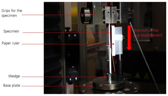 All of the experiments were carried out on a quasi-static Zwick Z250 electro-mechanical test machine, equipped with a load cell of capacity 10 kN with an accuracy class of 0.5. A paper ruler was placed close to the specimens in the test machine in order to have a reference for image analysis. The image analysis further required the setup of a camera system to track and monitor crack propagation in the specimens. For this purpose, a camera type Basler acA2040-90um-NIR USB3 Vision Camera ace 1′’ with CMOSIS CMV4000 NIR-E monochrome 2048 × 2048 Pixel, 90 fps NIR-Enhanced Pixel size 5.5 × 5.5 μm2 and C-mount was used with a Zeiss Milvus 2,0/100 mm macro lens. Figure 1 and Figure 2 show the test setup for the WADCB test in full and in detail, respectively. The wedge, thickness 5.08 mm with rounded front, is the same as in [36], where wedge-loaded symmetric double cantilever beam specimens were successfully tested within a Hopkinson bar. All tests were performed using displacement control with a cross-head displacement of 5 mm/min. It was found that a “floating” wedge, able to glide on a base plate (see Figure 1), was more suited than a fully fixed wedge. The gliding of the wedge on the base plate avoids the introduction of bending loads in the uncracked section of the specimen, which is a major advantage for the calculation of the energy release rate and for the execution of the tests.