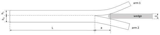 where P1 and P2 are the forces acting on each arm, and δ1 and δ2 are the displacements of the two arms. In Equation (2), the contribution of the strain energy generated by longitudinal loads (as the friction forces between the wedge and the arms of the specimen) are neglected. In fact, this contribution is an order of magnitude smaller than the bending-induced strain energy. Using beam theory, the following relationships between the displacements and the forces exist: