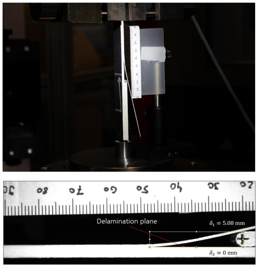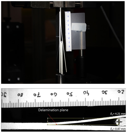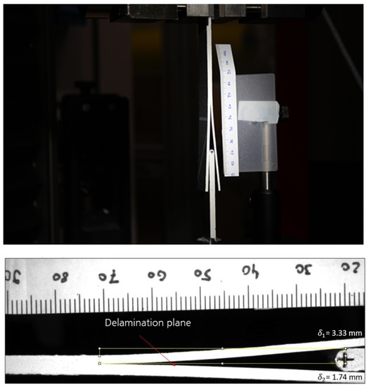 Equation (8) allows for calculating the total fracture toughness without the need for measuring forces, which may be beneficial for tests under high rates of loading [35,38]. The only parameters to be determined are the crack length and the deflections δ1 and δ2 of the two arms. It is known that the total deflection δ1 + δ2 equals the thickness of the wedge. All remaining parameters are either material constants or geometric parameters. As the crack length contributes to the total fracture toughness with the power of 4, it is important to minimize the error on determining the crack length. It was therefore decided to determine the effective delamination length, defined as the distance from the crack tip to the contact point between the specimen and wedge, using the open source image processing package Fiji App, which allows for measuring distances in images. Furthermore, the effect of error on the measurement of the crack length was evaluated. Other accurate techniques, for example, based on the extrapolation of the arm edge profile to find the crack tip, have been proposed in the literature [36].