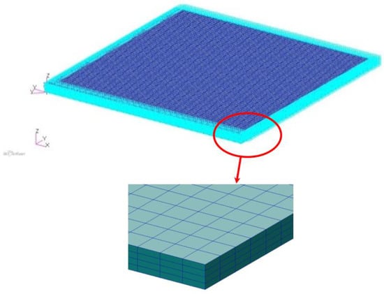 Composite Plate is divided into 8 layers and ply angle is 02°/452°/902°/−452°. The thickness of each two plies is 0.0025 m. The ratio of the thickness of each angle is 1:1:1:1. The length or width is 1 m, respectively, and the thickness is 0.01 m. The material is T300. In MSC.Patran, the establishment of finite element model was carried out. The number of nodes was 51005, the hexahedral element number was 40,000 and the plate had four-sided simple support constraints. The X and Y axes of the coordinate in Figure 1 are along the length and width of the plate, respectively, and the Z axis is determined by the right-hand rule to be perpendicular to and outward from the plate surface.