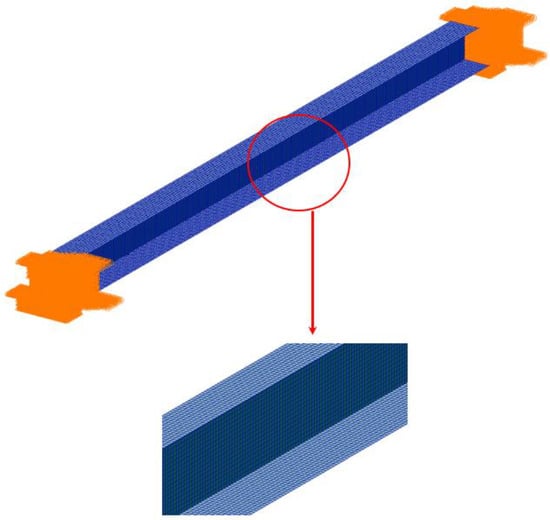 The composite I beam was divided into upper fringe (26 mm × 3.885 mm), lower fringe (46 mm × 3.33 mm), Middle Web (30 mm × 2.96 mm). The ply angle consists of 0°/45°/90°/−45°. The length and width of the beam are both 620 mm. The material is T300. In MSC.Patran, the finite element model was set up. The finite element model is shown in Figure 2. The number of nodes is 18,038, the number of 2D elements is 17,670, and both ends of the beam were fixed.