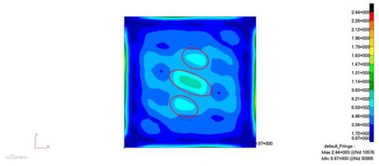 Figure 3 and Figure 4 show the vibration characteristics of the composite plate. It can be seen that the peak displacement and the distribution of the vibration strain are not regular. In MSC.Patran, PCL (Patran Command Language) functions were written for the linear summation of the first 20 order modal strain energy. The distribution of modal strain energy is indicated in Figure 5.