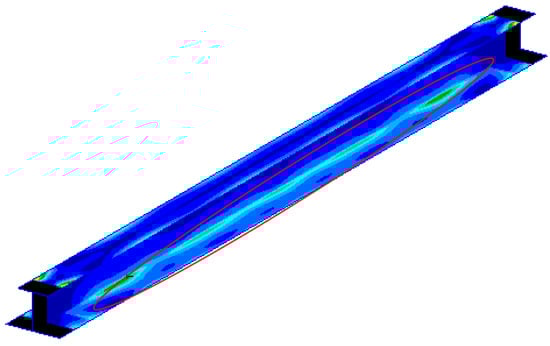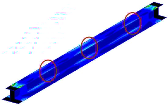 From Figure 9, it can be seen that the high strain energy zone is located at the junction between the lower flange and the web, and the high strain energy of the structure is located along the connection line between the lower flange and the web. According to the formula in Section 3.2 (Equations (7) and (8)), the modal frequencies, modal participation factors and weight coefficients of each order are given in Table 2.