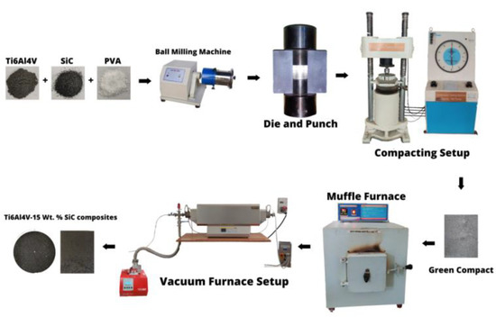 In recent years, there has been a lot of demand for the replacement of novel materials with conventional metals for their application in aeronautical, automotive, and marine industries. Metal matrix composites (MMCs) are a new class of materials, having metal as a matrix and fibers or particles as a reinforcement, due to its unique properties such as its high strength to weight ratio, ductility, stiffness, and improved corrosion resistance [1,2]. However, there are challenges in the production of a few MMCs such as titanium matrix composites (TMCs) which are prone to high levels of oxidation and embrittlement [3,4,5,6]. Powder metallurgical and near net shape manufacturing routes have always been preferred for the production of TMCs owing to their advantages, such as a homogenous distribution of the reinforcement [7,8,9,10]. Powder metallurgy involves the compaction of composites followed by a sintering just below their melting points [11,12]. Researchers [13] suggested that Titanium undergoes an oxidation above 600 °C and produces brittle Titanium Oxide which decreases the desirable properties of TMCs. Researcher [14], in his research, suggested that the density, hardness, and surface roughness can be improved under a vacuum sintering. Researchers [15,16,17] concluded that under a vacuum sintering, the process input parameters such as the aging time (h), aging temperature, and heating and cooling rates has a considerable effect on the process output characteristics on TMCs. Researchers [18,19,20] suggested that the application of the Design of Experiments is one statistical tool applied in the processing and machining of various metals/alloys and composite materials to obtain the optimum process output parameters. Researchers [21,22,23,24,25,26,27,28,29,30,31,32,33,34,35,36,37] suggested that Taguchi’s Design of Experiments (TDOE) is one of the most effective methods for obtaining an optimum value with a minimal set of experiments. Researchers [38,39] applied an analysis of variance (ANOVA) to obtain the percentage contribution of each of the input parameters selected. Researchers [40,41] concluded that response surface methodology (RSM) is a mathematical and statistical method which optimizes the response by evaluating the effects of various factors and their interaction on the response variables. Researchers [42,43] suggested that machine learning is a computational model designed to predict the output variables for a given set of input variables. Random forest regression (RFR) is one of the machine learning techniques which uses ensemble learning methods for the regression. Ensemble learning methods combine the predictions from multiple machine learning algorithms and can make a more accurate prediction than a single model [44]. Studies on problem solving by developing machine learning-based prediction models suggested that random forest algorithms performed better than other algorithms in the utilization of machining data [45,46,47,48,49,50,51,52]. This paper focuses on determining the favorable vacuum sintering conditions for Ti-6Al-4V reinforced with 15 Wt. % SiCp composites under a different aging temperature (°C), aging time (h), heating rate (°C/min), and cooling rate (°C/min) to improve the process output parameters such as the hardness and surface roughness, and to reduce the porosity using Taguchi’s Design of Experiments. Finally, response surface methodology and random forest regression have been used to predict the optimum process output parameters.