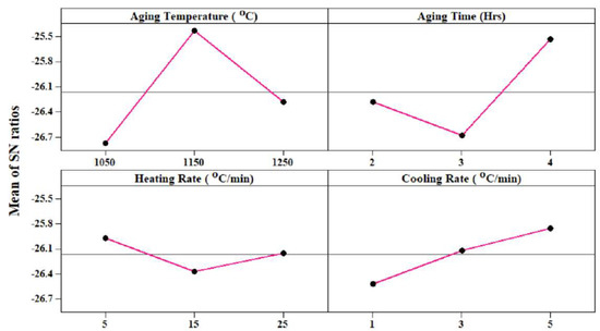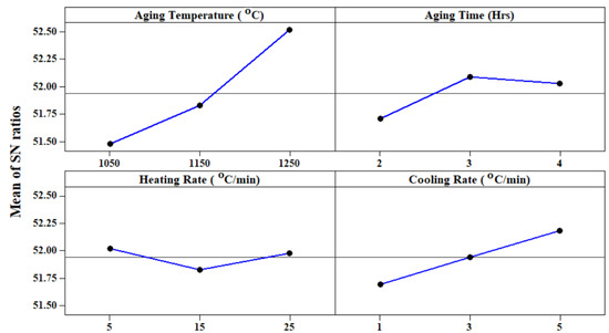 The main effects plot for the hardness (Figure 3) indicates the selection of the aging temperature (1250 °C), aging time (3 h), heating rate (5 °C/min), and cooling rate (5 °C/min) results in the best combination to get the higher hardness value during the processing of the Ti-6Al-4V-SiCp composites.