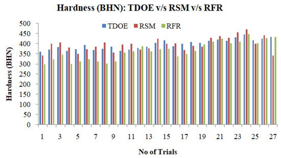 During the processing of Ti-6Al-4V-15 Wt. % SiC, the hardness, porosity, and surface roughness have been the most effective way of understanding the mechanical characteristics. Hence, in this section, the effect of the process input parameters such as the aging temperature (°C), aging time (h), heating rate (°C/min), and cooling rate (°C/min) on the process output parameters such as the hardness (BHN), porosity (%), and surface roughness (µm) using the TDOE, RSM, and RFR has been discussed in this section.