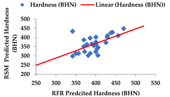 To predict and verify the hardness during the processing of the Ti-6Al-4V-SiCp composites, the verification tests are used. Figure 4 shows the experimental results along with the results of the mathematical model and the random forest regression for the hardness. The comparison of the experimental results with the mathematical model and RFR model results obtained for 27 trials shows that the estimated value is accurate for all tests with an error of 1.106% with the RSM and 8.981% with the RFR estimated values, respectively. Figure 5 represents a scatter plot for the hardness values of the Ti-6Al-4V-SiCp composites.