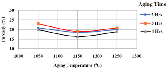 A study on the porosity during the processing of the Ti-6Al-4V-SiCp composites is one of the effective ways of understanding the material characteristics. Figure 6 shows the comparison of the porosity under a different aging temperature (°C), aging time (h), heating rate (°C/min), and cooling rate (°C/min). From Figure 6, it is observed that the porosity decreases as the aging temperature is at 1050 °C, compared to 1150 °C and 1250 °C aging temperatures. This is because 15 Wt. % SiC resulted in an increase in the density and a decrease in the porosity. Further, the addition of a PVA binder of 3 Wt. % enabled in the proper adhesion of Ti-6Al-4V and SiCp to increase the hardness value. The compaction pressure during the processing of the Ti-6Al-4V-SiCp composites showed no much difference on the hardness. However, at the compaction pressure of 4 ton/sq.inch, there was a small increase in the hardness value. This is because the compaction pressure resulted in an interlocking of the SiC particles with the Ti-6Al-4V alloy followed by a strain hardening.
