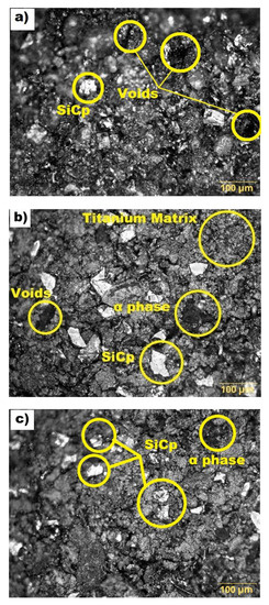 Figure 8 shows the microstructure of the compacted and vacuum sintered Ti-6Al-4V-SiCp composites under different processing conditions. From the microstructural observation, it was observed that the composites processed under the aging temperature (1050 °C) had a more void formation compared to the composites processed under the aging temperature (1150 °C) and (1250 °C), respectively. Further, aging at 1250 °C resulted in the formation of α-phase, which caused a decrease in the porosity values compared to the aging temperature at 1150 °C. It was also observed that an increase in the SiCp resulted in a crack formation due to a decrease in the bond strength and interlocking between the matrix and reinforcement particle.
