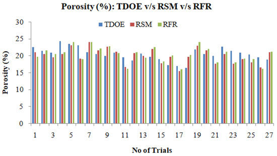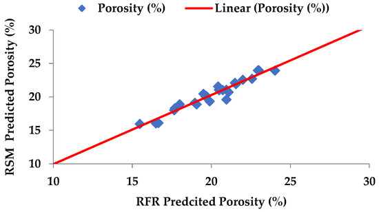To predict and verify the porosity during the processing of the Ti-6Al-4V-SiCp composites, verification tests are used. Figure 9 shows the experimental results along with the results of the mathematical model and random forest regression for the porosity. A comparison of the experimental results with mathematical model and RFR model results obtained for the 27 trials shows that the estimated value is accurate for all tests with an error of 2.76% with an RSM and 1.3% with the RFR estimated values, respectively. Figure 10 represents a scatter plot for the porosity values of the Ti-6Al-4V-SiCp composites.