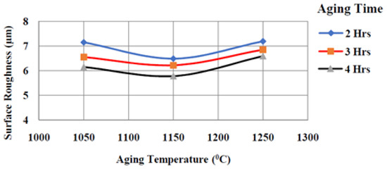 A study on the surface roughness during the processing of the Ti-6Al-4V-SiCp composites is one of the effective ways of understanding the material characteristics. Figure 11 shows the comparison of the surface roughness under a different aging temperature (°C), aging time (h), heating rate (°C/min), and cooling rate (°C/min). From Figure 11, it is observed that at an aging temperature of 1150 °C and an aging time of 4 h resulted in an improved surface roughness value (5.78 µm). This is because an aging temperature of 1150 °C and a 4 h aging time resulted in a better bonding and a decrease in the porosity between the Ti-6Al-4V and SiC particles.