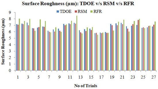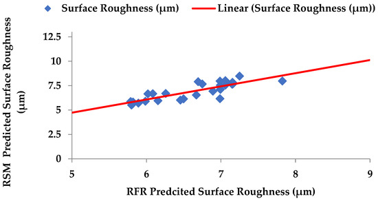 To predict and verify the surface roughness during the processing of the Ti-6Al-4V-SiCp composites, verification tests are used. Figure 14 shows the experimental results along with the results of the mathematical model and random forest regression for the surface roughness. A comparison of the experimental results with the mathematical model and RFR model results obtained for the 27 trials shows that the estimated value is accurate for all tests with an error of 1.56% with the RSM and 2.75% with the RFR estimated values, respectively. Figure 15 represents the scatter plot of the surface roughness values of the Ti-6Al-4V-SiCp composites.