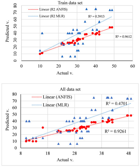 Correlation between the actual data of tensile index (MPa) and predicted ones by ANFIS and MLR models in both training and all data (blue triangles and red circles marks belong to MLR and ANFIS models, respectively).