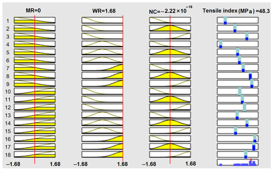 The diagram of the general block of ANFIS is composed of three inputs and one output as shown in Figure 3. The output parameter or the paper’s tensile index evaluating the mechanical efficiency depends on three input parameters, i.e., MR, WR and NC.
