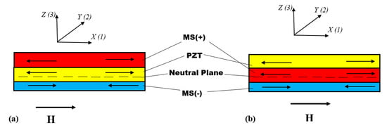 Schematic drawing of (a) Type 1 and (b) Type 2 asymmetric trilayers, with PZT layer of thickness and magnetostrictive (MS) layers with positive (MS+) and negative (MS−) magnetostriction and thicknesses and , respectively. The dashed line represents the neutral plane.