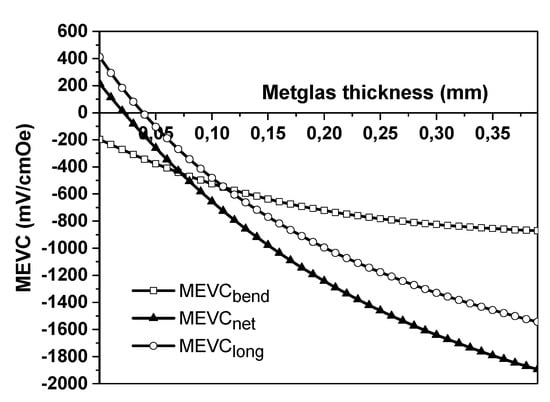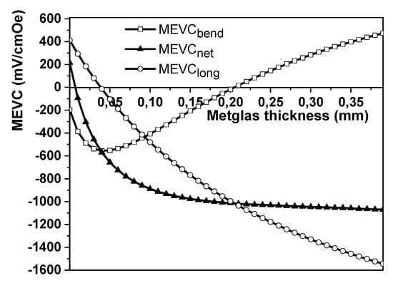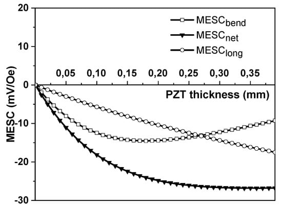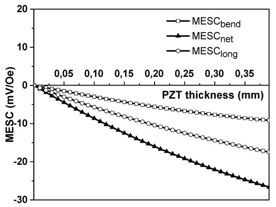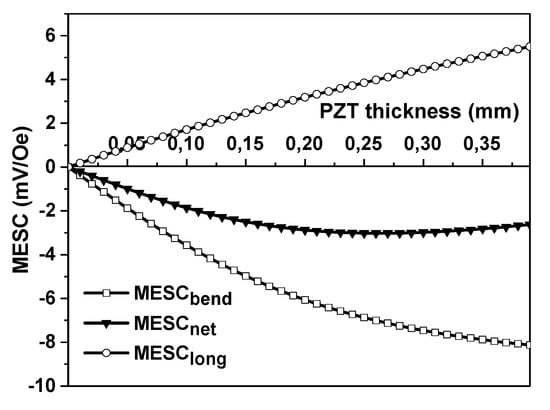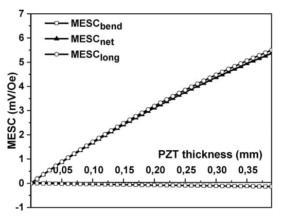 Figure 3 shows the estimated variation in MESC with the thickness of the PZT layer. The Ni thickness and Metglas are assumed to be 0.2 mm. These thicknesses were chosen because they correspond to the region where the MEVC has a maximum. The MESC is zero at . The MESC caused by longitudinal deformations increases with the increase of PZT layer thickness and is predicted to attain saturation at . This saturation value of MESC equals: