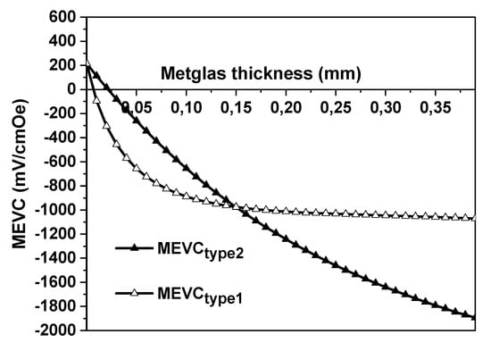 Estimated dependence of MEVC in Ni-PZT-Metglas (Type 1) and Ni-Metglas-PZT (Type 2) three-layered structures on the Metglas layer thickness. The PZT layer thickness , the Ni thickness