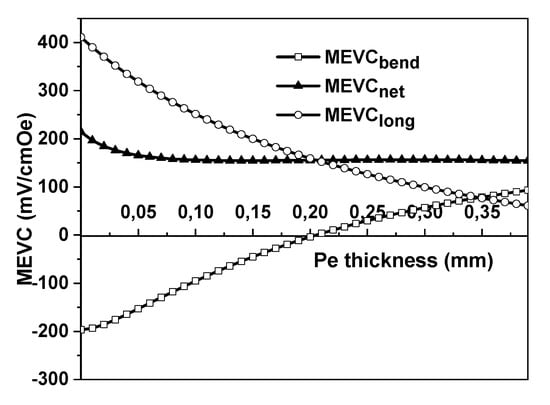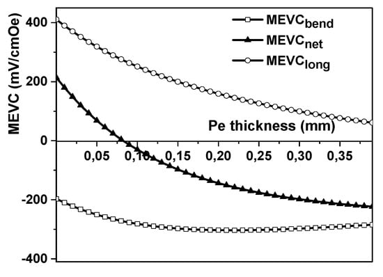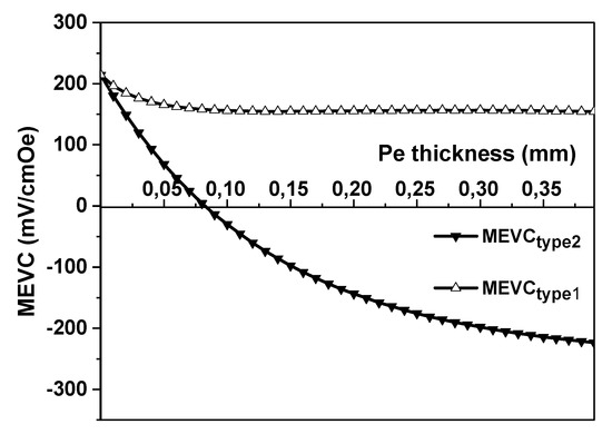 Figure 11 shows the dependencies of the net MEVC as a function of Pe thickness for both the first and second types of structures. As can be seen from Figure 11, both Ni-PZT-Pe structures have the same value as for the bilayer Ni-PZT structures; thus, using the three-layered Ni-PZT-Pe structures is impractical.
