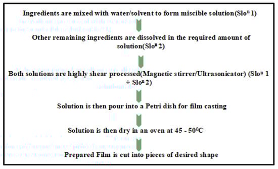The principle of the solution casting method is based on ‘Stokes law’ []. The polymer has the matrix phase easily dissolved in the solution, whereas the NPs are dispersed in the same solution or a different solution and, finally, both of them become intermixed. The solution is dispersed on clay after the process of swelling within the solvent. A decrease in entropy occurs due to the distortion of solvent molecules from the polymer/clay composites. In this manner, the entropy decreases to establish an intercalated chain. Due to the evaporation of solvent molecules, a nano composite structure is established and to do this, either a magnetic stirrer or an ultra-sonicator is required, with temperature control [,]. In this method, different polymers (host and guest polymers) are equally merged to form the suitable solution. The polymer (being the matrix phase) dissolved easily in solution I (with proper solvent) whereas, the NPs dispersed either in solution I (same solution) or in solution II (different solution). These are then allowed to be mixed by putting them on a stirrer for the definite/specific time for proper miscibility [,]. Generally, the films of perfect miscibility and uniform thickness are synthesized by this method, which is the most popular and easy, and can be performed in normal laboratories with normal precautionary measures. The whole process is summarized in Figure 1.