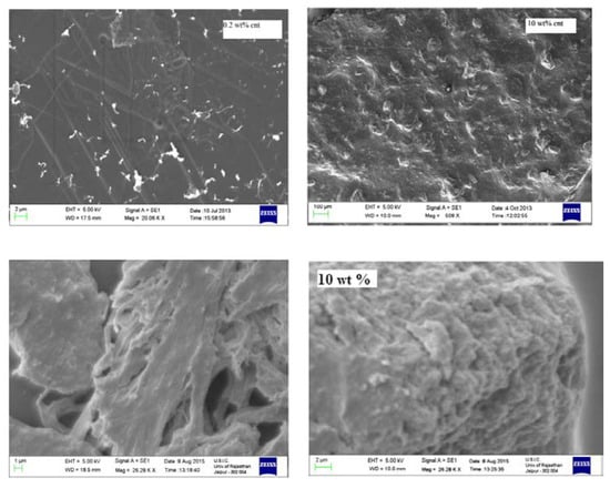 SEM micrographs representing miscibility of MWNT/PMMA with the increasing content of MWNT. Reprinted from [] with the permission of Materials Research Express.