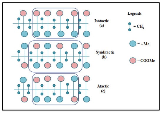 As the next sections describe the tuning of dielectric properties of PMMA by forming composites with different inorganic materials (fillers), it is essential to review the structure of PMMA. In this context, PMMA is polymerized from the ‘monomer methyl meth acrylate by initiators (free radical), such as ‘peroxides and azo-compounds via free radical’ vinyl polymerization and are exemplified as below. It has excellent retention ability and compatibility with liquid electrolytes and exhibits good interfacial stability towards lithium electrodes. Moreover, few studies showed that the dielectric properties of such composites are also changed and affected due to the polymer chain tacticity, such as the relaxation time Tg [,,,]. The α-relaxation were studied for iso-tactic PMMA thin films supported on aluminum [] where the dielectric properties are changed due to the change in the thickness of the film [,], which is a concept of stereo chemistry having relative arrangement within the polymer chains adjacent to chiral centers. It is studied that there are 3 ‘stereo regular arrangements’ obtained from PMMA viz.: (a) Iso-tactic; (b) Syndi-tactic; and (c) A-tactic, as shown in Figure 4.