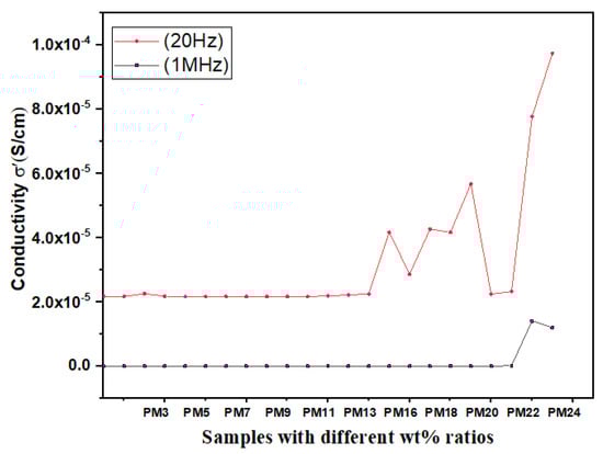 Conductivity “σ” dependence on different polymer nano composite films at frequencies 20 Hz and 1 MHz.