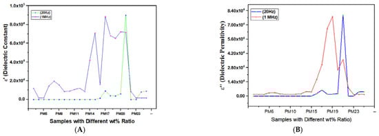 From the graphs in Figure 7A,B, it is said that the dielectric properties of TiO2 doped multifunctional polymer NCs has nonlinear behavior. However, ZnO dispersed matrix composites named as high-performance flexible nano dielectrics with high value in dielectrics constant and improved conductivity at low frequencies (20 Hz), which are used in multifunctional microelectronic devices [,,,,,]. Significantly enhanced dielectric properties and ‘chain segmental dynamics’ were observed in SnO2 doped NCs []. Material permittivity is a static property, whereas conductivity is purely dependent on its dynamic property, thus to connect relation between these physical quantities a perfect time scale selection is required. Thus, from above graph, it is clear that the magnitudes of the dielectric constant for higher frequencies are low for both the values of the real and imaginary part of dielectric permittivity. The dielectric constant of the given or selected samples shows the amount of electrical energy that can be stored on applying voltage [,,,,,,]. Thus, a dielectric material can become polarized when subjected to an electric field; on polarization of such materials, the electric field is thus reduced. Additionally, to correlate conductivity to dielectric constant we need to find the loss factor of our materials, which is the ratio of (ε″/ε′). All the samples containing PMMA have less values of loss factor, which for a higher frequency range (1 MHz) is less, as compared to a lower frequency range (20 Hz).