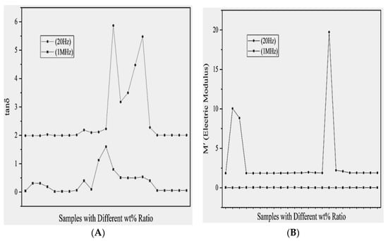 The graph in Figure 8A shows that the loss is relatively high for the materials containing PEO/PMMA (50/50 wt%)/LiClO4 (3 wt%), PEO/PMMA (50/50 wt%)/LiClO4 (3 wt%)/Al2O3 (3 wt%) and PEO/PMMA (50/50 wt%)/LiClO4 (3wt%)/SiO2 (3 wt%), but overall the loss is not very high. Its dielectric constant value is increased with the loading filler and their increasing content, comparing the data from Table 1 it is clear that the polymer blend PMMA/PVC has ε′ is equal to 0.17, the polymer blend with filler metal oxides such as PMMA/PVA/ZnO or SnO2 has nearly 1.8 dielectric constant. However, for the polymer blend with filler salts or salt + metal oxides such as PEO/PMMA + LiClO4 + ZnO, ε′ is 90,000, an extremely good result of the dielectric constant and properties. Further, it is clear for some of the samples that the measurement of loss factor at very high frequency shows no change, but for low frequencies it has high values in the case of metal oxide doped PMMA, than for the salt filler PMMA. Electric modulus is the important dielectric property of the polymer blends and physically corresponds to the relaxation of the electric field in the materials, electric modulus for low frequency variation shows changes for the differently doped polymer blends, while for higher frequencies (1 MHz depicted) it becomes independent to the dopants and their concentrations in the PMMA based polymer blends depicted in Table 1 [,,,,,,,,,,,,,,,,,]. Additionally, the complex permittivity is the inverse of permittivity of the material. This helps in finding relaxation phenomenon in the ceramic materials, as well as in ionic conductors.