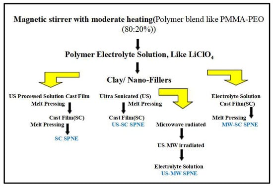 There are many other techniques used by the researchers to prepare solid polymer nano electrolyte films, using an ultra sonicator or microwave radiation. It was found that for the preparation of MMT, dispersed PMMA-PEO-LiClO4 PNC film, such as radiation techniques, are implemented. In this, Microwave Radiation (MW), Ultra Sonicated (US), US-MW irradiated, and Solution Cast (SC) are used in the manner shown in Scheme 1, below; the polymer composite films are then further characterized by an impedance analyzer for their dielectric properties [,,].