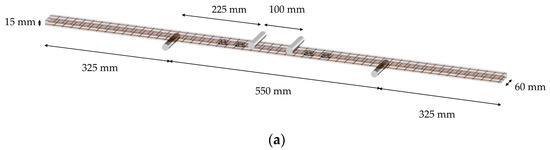 All TRC beams were manufactured in individual 1200 mm × 60 mm × 15 mm molds (Figure 5a). First, an oil film was applied at the bottom of the mold to facilitate the demolding process. The textile reinforcement was then placed in the mold and the matrix was poured. After filling the mold with mortar, the surface was covered with plastic film and the molds were sealed for 28 days to cure at room temperature. Six specimens were manufactured for each configuration. After demolding, the specimens’ side surface was painted white and speckled to allow the DIC monitoring of displacements and cracks during the experimental campaign. Figure 5b shows an image of the prepared spacer configuration before casting, and Figure 5c shows the TRC beams after demolding.