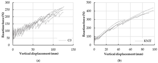 Reaction force (N)-displacement (mm) curves for all tested samples: (a) C0: samples without transversal connections; (b) KNIT: samples with knitted transversal connections; (c): C4MOMENT: samples with 4 transversal connections, placed in the moment zone; (d): C4SHEAR: samples with 4 transversal connections, placed in the shear zone; (e): C6SHEAR: samples with 6 transversal connections, placed in the shear zone; (f) C4FREE: samples with 4 transversal connections, placed in the free end zone; (g) C16FREE: samples with 16 transversal connections, placed in the free end zone; (h) C28: samples with 28 connections placed over the entire length.