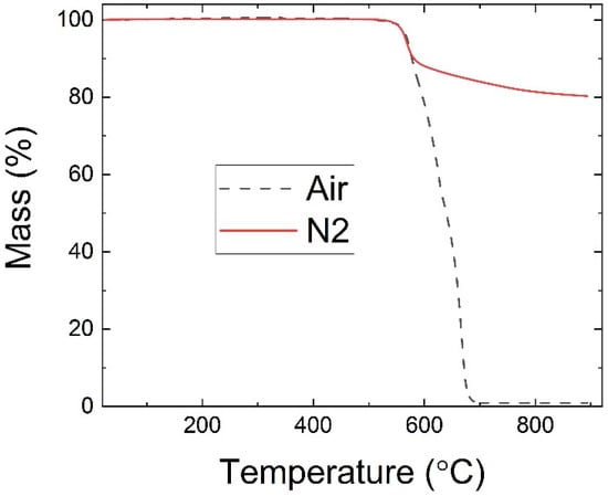 Thermogravimetric analysis (TGA) using a TA Q50 (TA Instruments, New Castle, DE, USA) was used to determine the decomposition, mass loss, and char yield of the Cf-PEEK printing tow or filament. Thermal treatment was performed at a 10 °C/min heating rate from room temperature to 900 °C in air and flowing nitrogen (N2) at a rate of 50 mL/min.