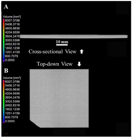 X-ray computed tomography (XCT) was done using a Zeiss Metrotom (Carl Zeiss Industrial Metrology, Maple Grove, MN, USA) to help identify delamination, pores, defects, and distortion. The scans were done with a 0.5 mm Cu filter at 180 kV, 97 µA, and 1000 ms with 16 µm resolution in the X, Y, and Z directions. All of the XCT data were reconstructed using VGstudio Max version 3.2.