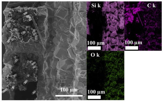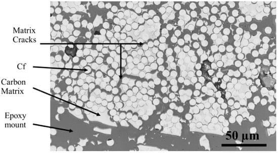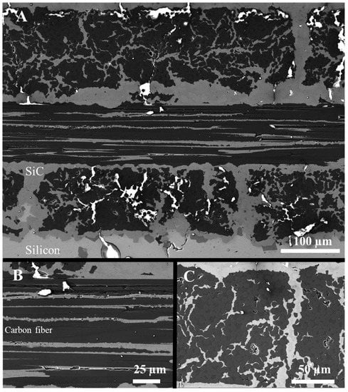 Figure 8 shows SEM images of cross-sections of the final C/C-SiC. Figure 8A shows several printing layers or tows where the in-plane and out-of-plane tows can be identified. The materials were identified by EDS, where the areas of SiC and unreacted residual silicon can be seen. Figure 8B shows a more magnified cross-sectional area of the in-plane carbon fibers and also shows the reaction-formed SiC in between the carbon fibers. Figure 8C shows a more magnified cross-sectional area of the out-of-plane fibers. The tightly packed carbon fibers are surrounded by the carbon matrix, and there are some areas of the cracks that were filled with reaction-bonded SiC and Si.