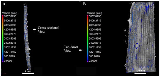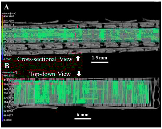 XCT scans of (A) cross-section and (B) top-down views showing the total porosity in the C/C-SiC composite.