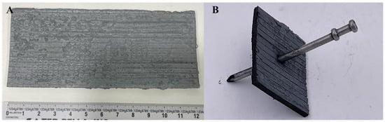The printing of the Cf-PEEK composites was done using an FFF printer called the Fiber from Desktop Metal (Burlington, MA). This printing style is known as micro automated fiber placement (µAFP), where tapes of previously impregnated Cf tows are forced through the heated nozzle and deposited onto the build platform. Tapes were laid down in 10 layers with alternating 0/90° direction. Each tape layer was 0.25 mm thick and 3 mm wide. The temperature of the build plate during printing was 150 °C. The temperature of the printing nozzle during printing was 350 °C.