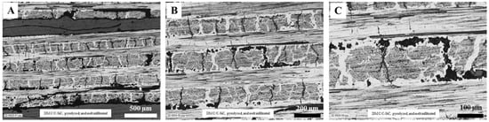 Optical images of a cross-section of pyrolyzed and Si-melt-infiltrated C/C-SiC composites, with increasing magnification (A–C).