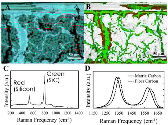 Figure 9 shows the results of Raman spectroscopy from a cross-section of the final C/C-SiC composite. The white region is the matrix carbon, gray is carbon fibers, red is residual silicon, and green is SiC. The Raman spectra collected from the SiC phase had broad peaks suggestive of a highly disordered structure. The polytype could not be identified [].